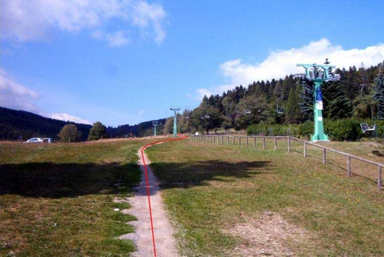 Wir überqueren eine Wiese bergaufwärts und lassen die Talstation eines Schleppliftes links hinter uns. (Hier blau sichtbar)