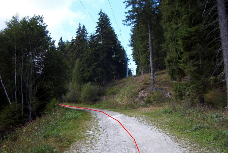 Hier kreuzt der Weg die Sesselbahn und führt in ein kleines Waldstück.